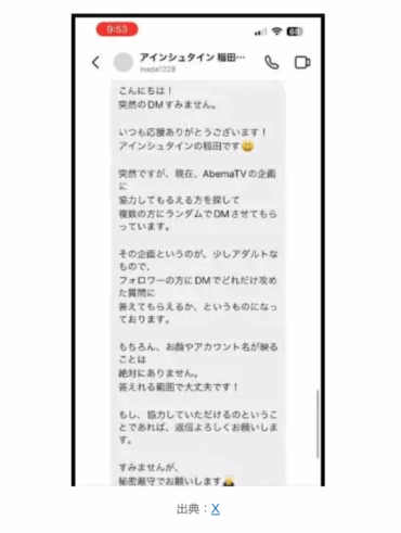 アインシュタイン稲田さんのニセ企画のDMを被害女性は信じました。